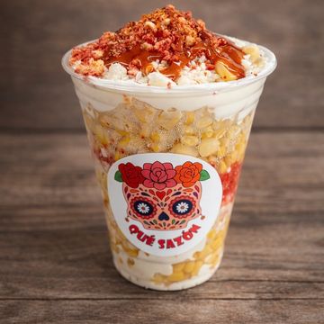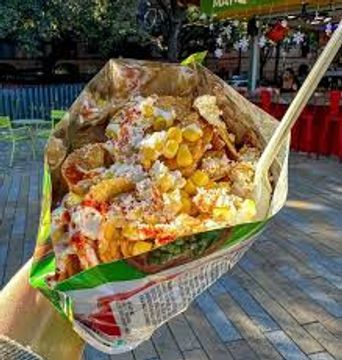 Crunchy tostitos topped with creamy elote, butter, mayo, chile and lime. A classic street style snack with bold flavor.
