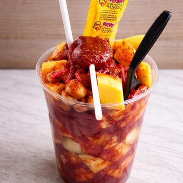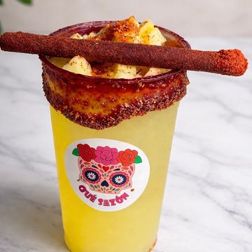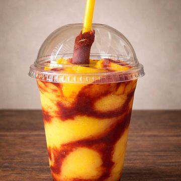 A frozen mango drink blended with chamoy, lime and tajin. Topped with mango and tamarind candy.