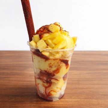 Sweet, tangy, and spicy mango ice cream layered with chamoy and Tajín, often served with fresh mango chunks and a tamarind candy straw for a complex, refreshing flavor explosion.